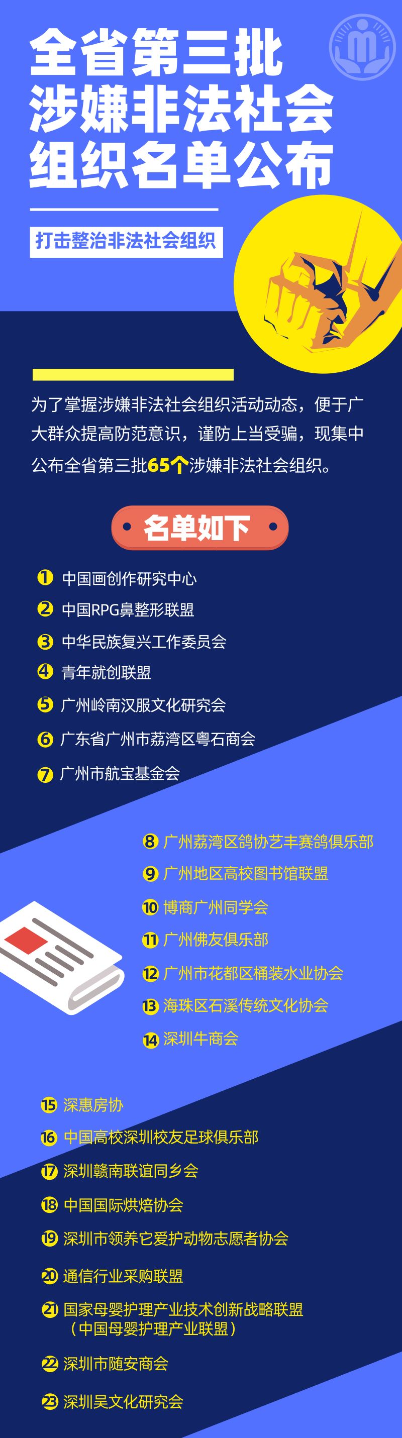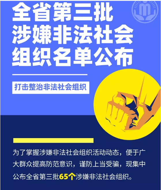 自广东省民政厅、广东省公安厅在全省范围内开展打击整治非法社会组织专项行动以来,各地重拳出击,全力打击利用“一带一路”、“军民融合”、“精准扶贫”、“乡村振兴”、“粤港澳大湾区”建设等,冠以“中国”、“中华”、“国际”、“广东”、“广东省”等字样,以及打着“传统文化”、“养生修炼”等旗号在我省开展非法活动、骗钱敛财的非法社会组织。为便于各地及时掌握涉嫌非法社会组织活动动态,提高广大群众防范意识,谨防上当受骗,现集中公布全省第三批65个涉嫌非法社会组织,名单如下: